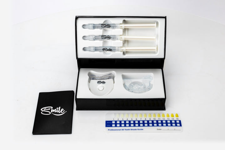 يشمل العناصر الضرورية كلها: جل التبييض، أدلة شفافـة أو قوالب الأسنان، وربما جهاز LED إن كان الطقم يحتويه.